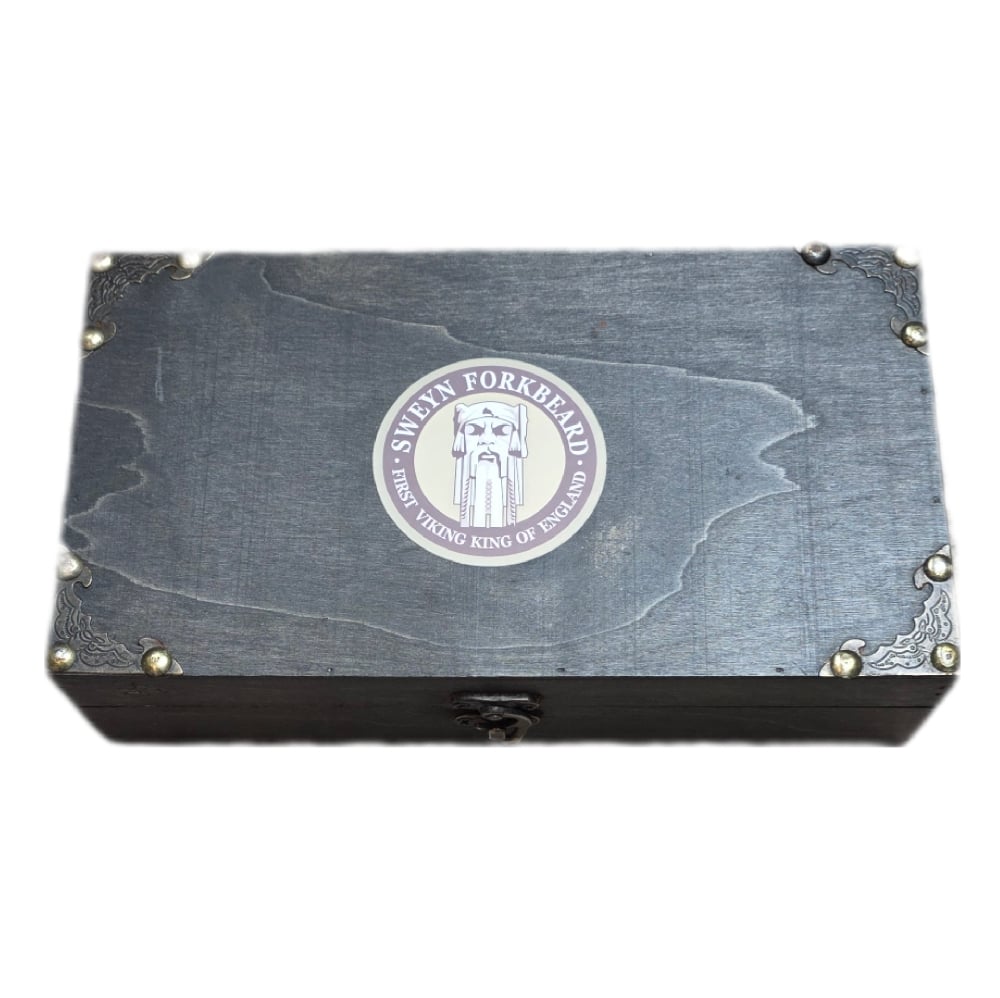 The set comes packed in a sturdy, vintage-style wooden box, featuring the iconic Sweyn Forkbeard seal – “The First Viking King of England.” Perfect for gifting or displaying with pride.