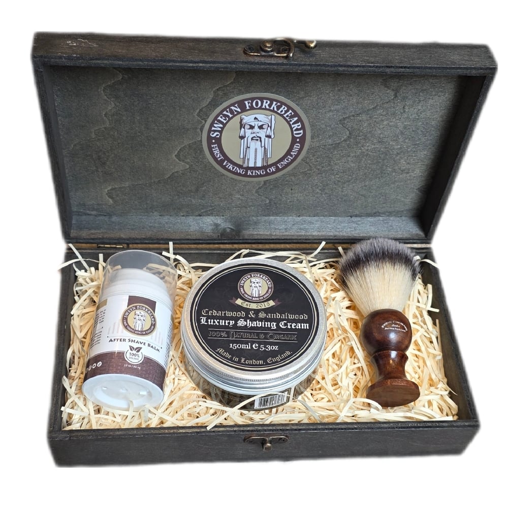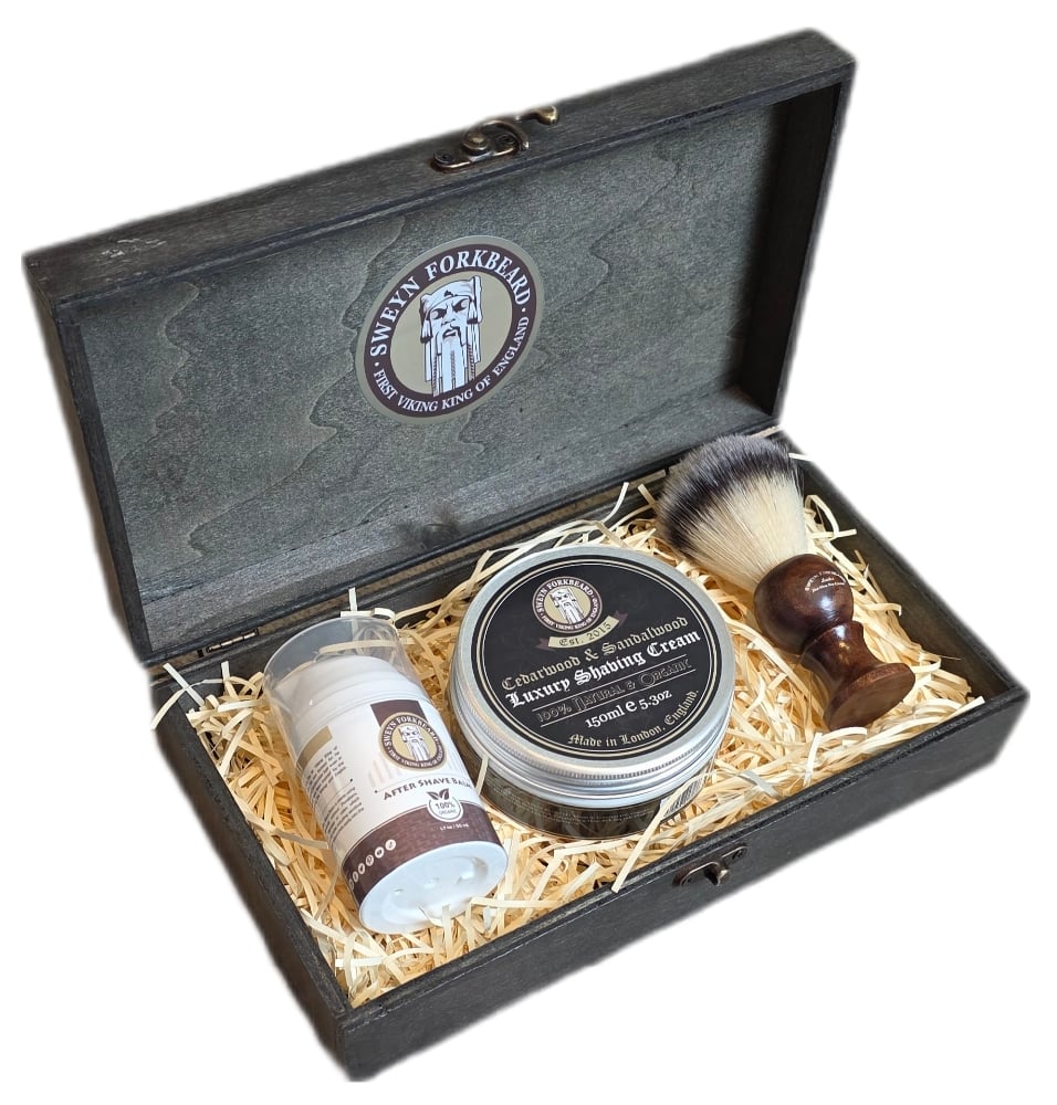 Embrace the spirit of the Viking age with this luxurious Sweyn Forkbeard Wet Shave Set, beautifully presented in a handcrafted Viking-style wooden box. Designed for the modern man who values tradition, craftsmanship, and quality, this premium set transforms your daily shave into a ritual worthy of a true warrior.